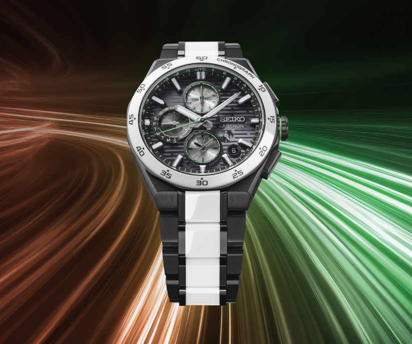 文字盤のとくちょうとしてダイヤルには、線が断続的に繋がる「ホリゾンタルパターン(横縞)」の新規型打ちを採用することで、光が走り抜ける表現をしています。さらに、ライトグリーンカラーのアクセントを加えた、スポーティなデザインが特徴です。
