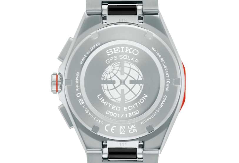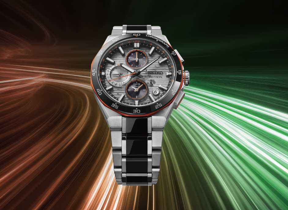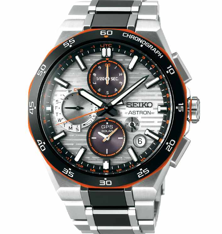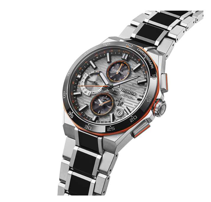 さらに、二層構造のベゼルは、セラミックスのパーツと多角形状の飾り縁を組み合わせた、限定モデルならではの特別仕様となっています。またベゼルとブレスレットの中駒にブラックセラミックスを組み合わせ、随所にネオンオレンジカラーのアクセントを加えた、スポーティなデザインが特徴です。