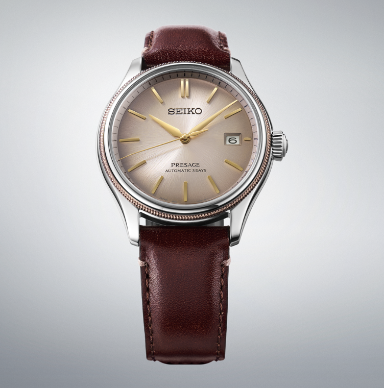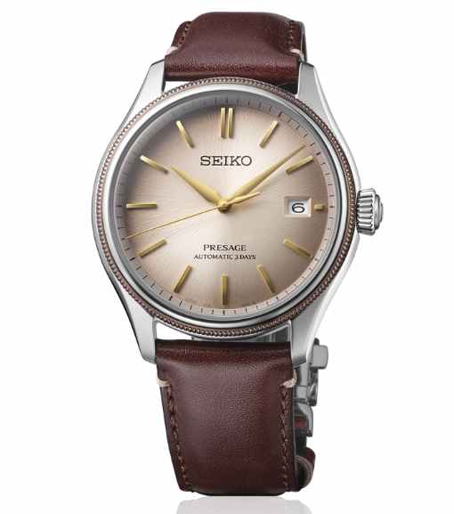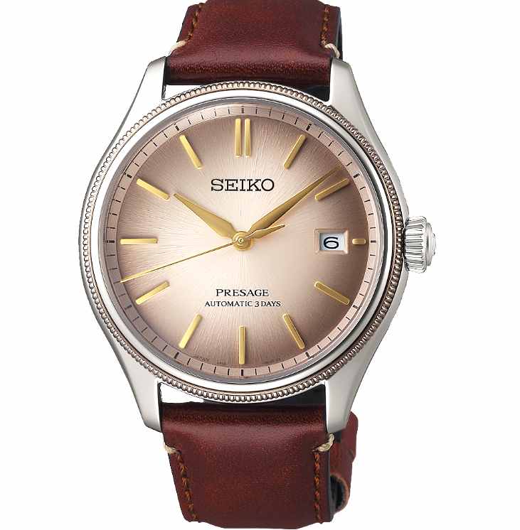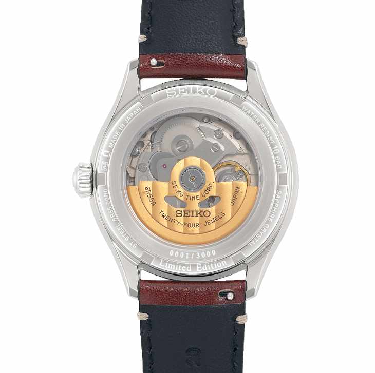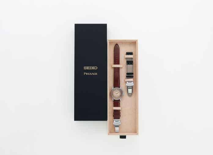 こちらは【セイコープレサージュ アップサイクルモデル】。国内販売本数が300本の限定モデル。ケースは専用のBOXがあり付属品として色違いの革ベルトが付いてきます。