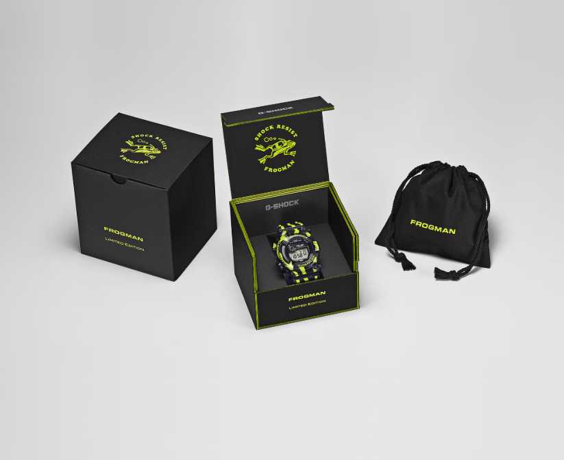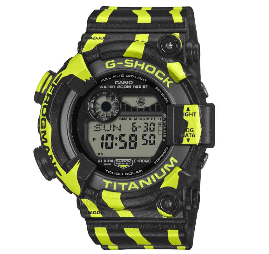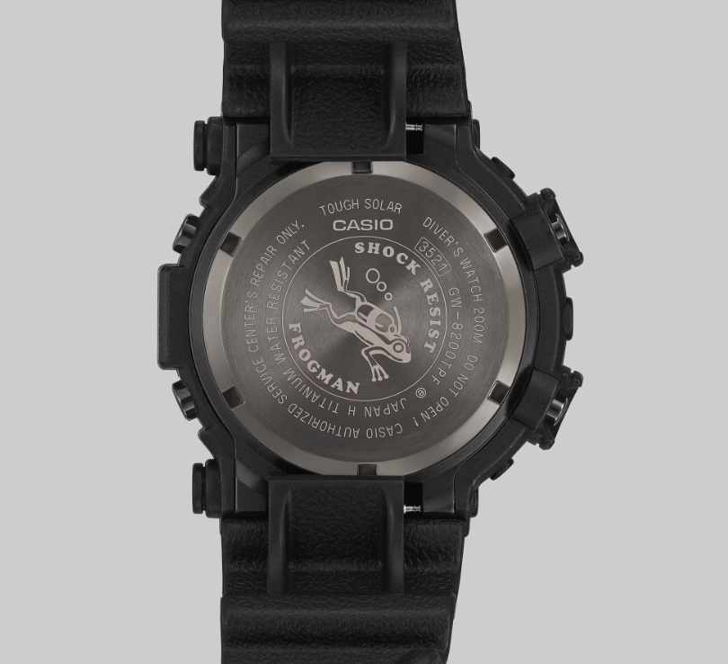 こちらは『カシオG-SHOCK フロッグマンシリーズ』。南アメリカの熱帯雨林に生息する“ミスジヤドクガエル*”をモチーフにデザインした、ISO規格200m潜水用防水機能を持つ本格ダイバーズウオッチFROGMANです。 ブラックベースに大胆な蛍光グリーンの縦縞模様を施し、ミスジヤドクガエルの強力な毒性を象徴する鮮やかでタフなデザインに仕上げました。でこぼこの皮膚の質感はバンドとベゼルへのスプレー塗装で再現。さらに、ケース裏のカエルのキャラクター刻印もミスジヤドクガエルの縦縞模様を纏った特別仕様に仕上げています。タフソーラーを備え、蛍光灯のわずかな光でも発電し強負荷のかかる各種機能を安定駆動。