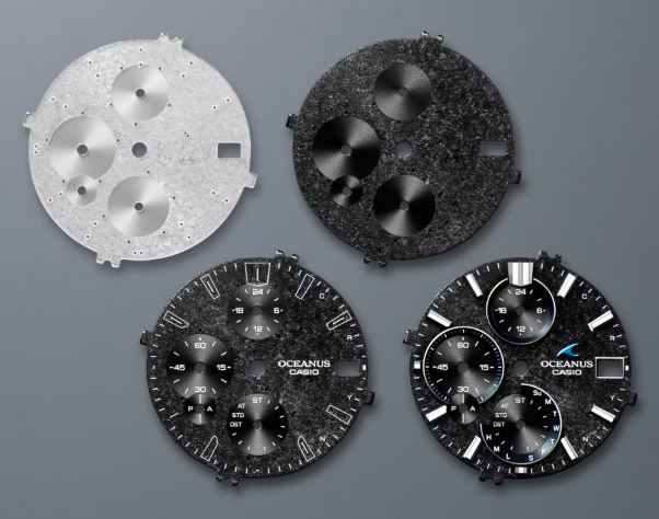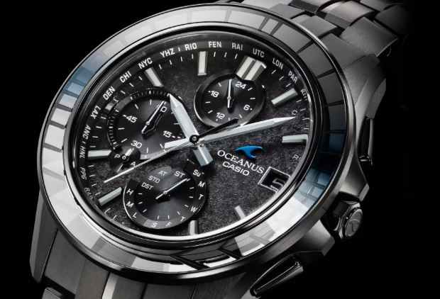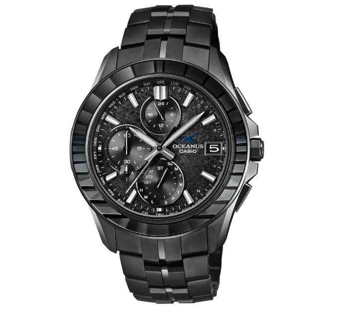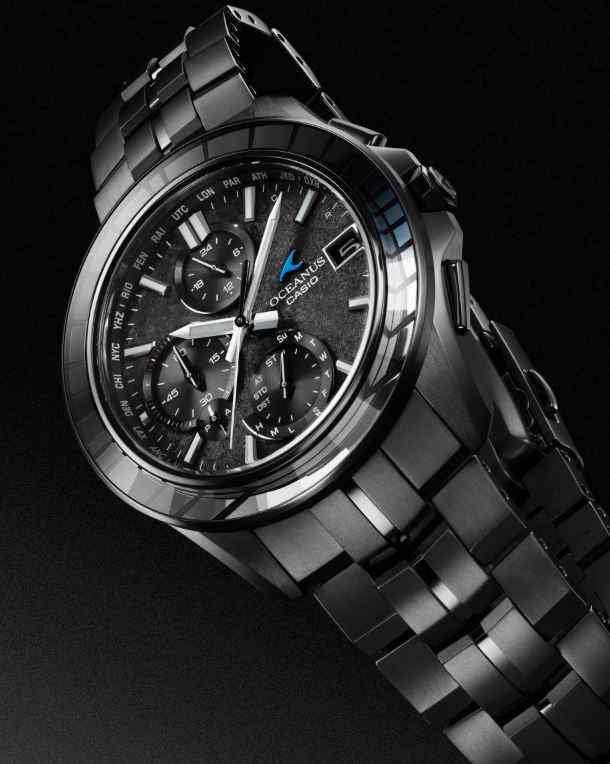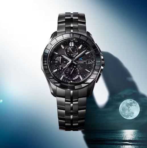 こちらは『カシオ オシアナス世界1600本限定』。こちらのシリーズは、OCEANUSが誇るものづくりの技術と日本の伝統技法が美しく融合したモデルです。上下で異なるカッティングラインが美しいサファイアガラスベゼルが特徴で、江戸切子の職人が一つひとつ手作業でカットを施して仕上げています。 デザインテーマは「CALM NIGHT」。 月の光に照らされた夜の海を、オールブラックのチタン外装と江戸切子のサファイアガラスベゼルで表現しました。硬いサファイアガラスに幅、深さを均一に切り込みを入れ、江戸切子にしか表現できない煌めきとシャープな美しさが魅力です。 深みと輝きを生み出すシルバーとブラックのグラデーションカラーは、どこまでも続くような海の広大さを表現。光の加減でブルーカラーに偏光し本物の海を思わせます。 また、月面の凹凸や陰影をモチーフにしたテクスチャーダイアルを採用。マットな質感で、月面の繊細かつ優美な表情を表現しました。